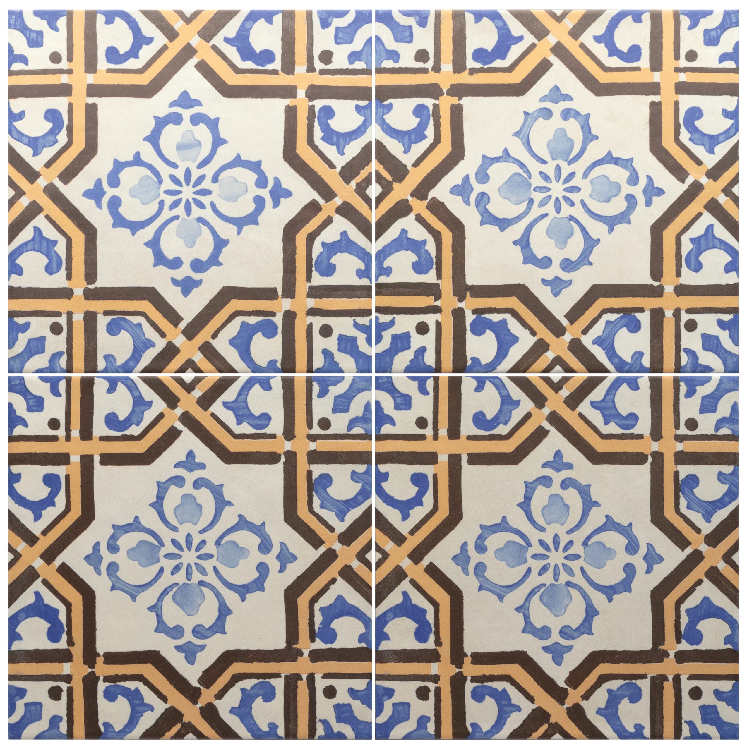 El azulejo porcelánico Ares 20x20 cm destaca por su diseño hidráulico de inspiración mediterránea, capaz de aportar carácter, tradición y un estilo atemporal a cualquier espacio. Inspirado en los clásicos suelos de cementina, presenta composiciones decorativas como la mostrada, con motivos geométricos y florales en tonos azules y tierras que evocan la esencia del diseño artesanal.
