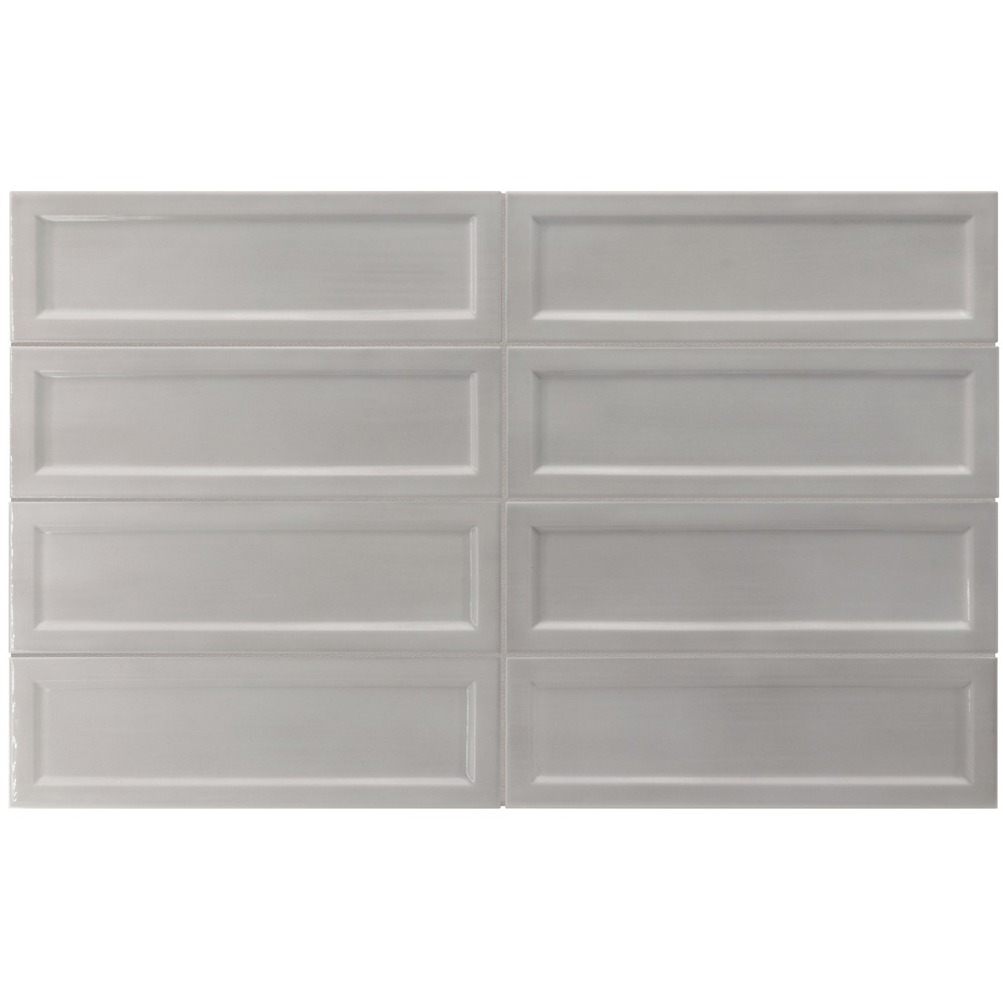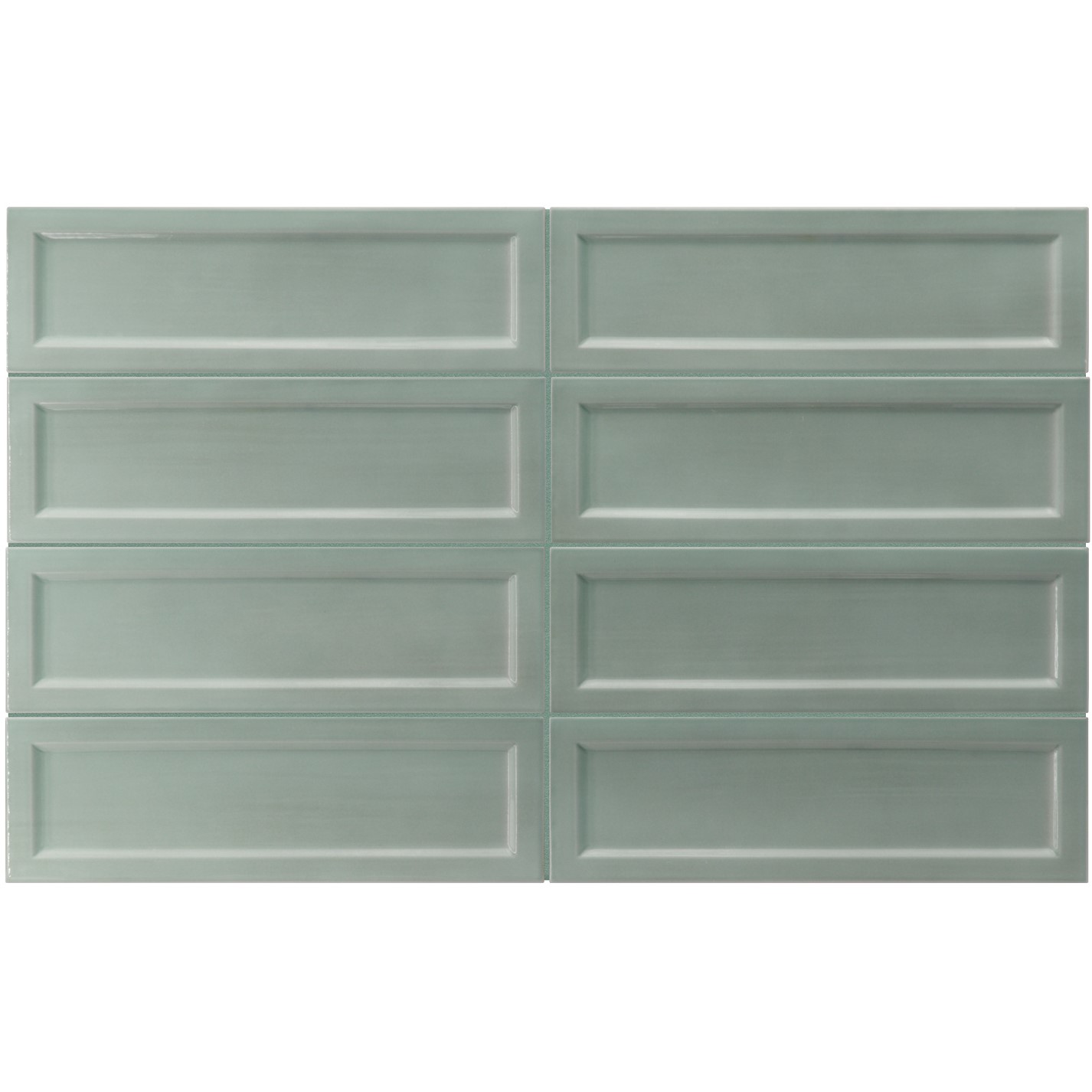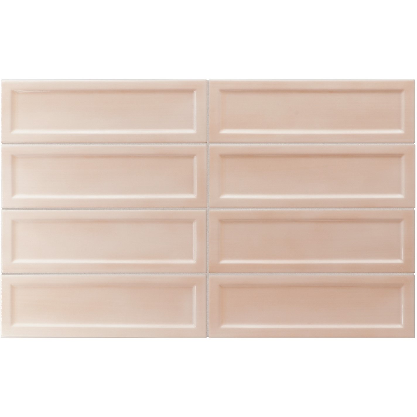 La serie incluye dos versiones complementarias: una pieza lisa y otra con relieve decorativo, como la que se muestra en la imagen. Este relieve enmarcado aporta profundidad visual y un sutil juego de luces y sombras que realza el brillo del esmalte, creando paredes con mayor personalidad y sofisticación.
