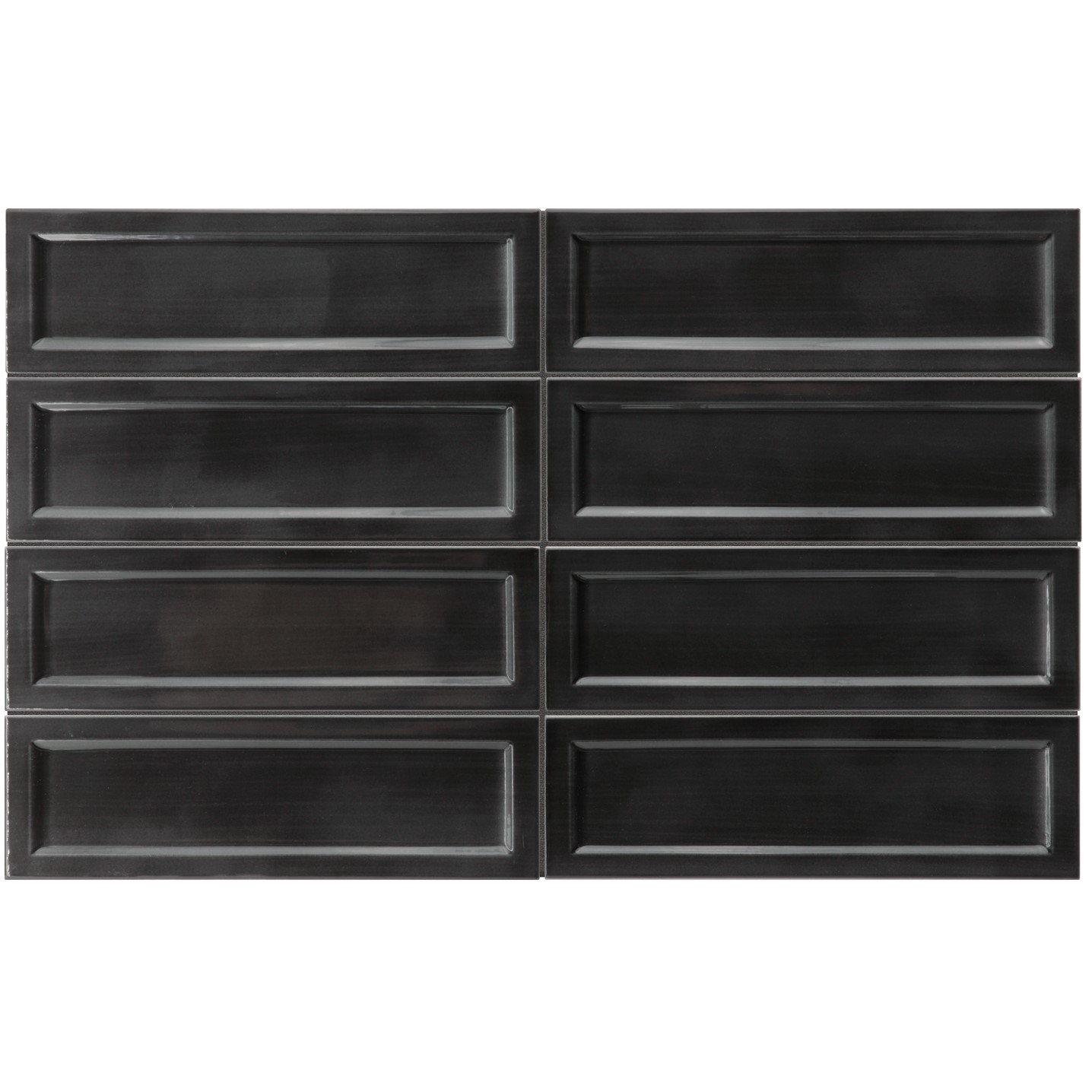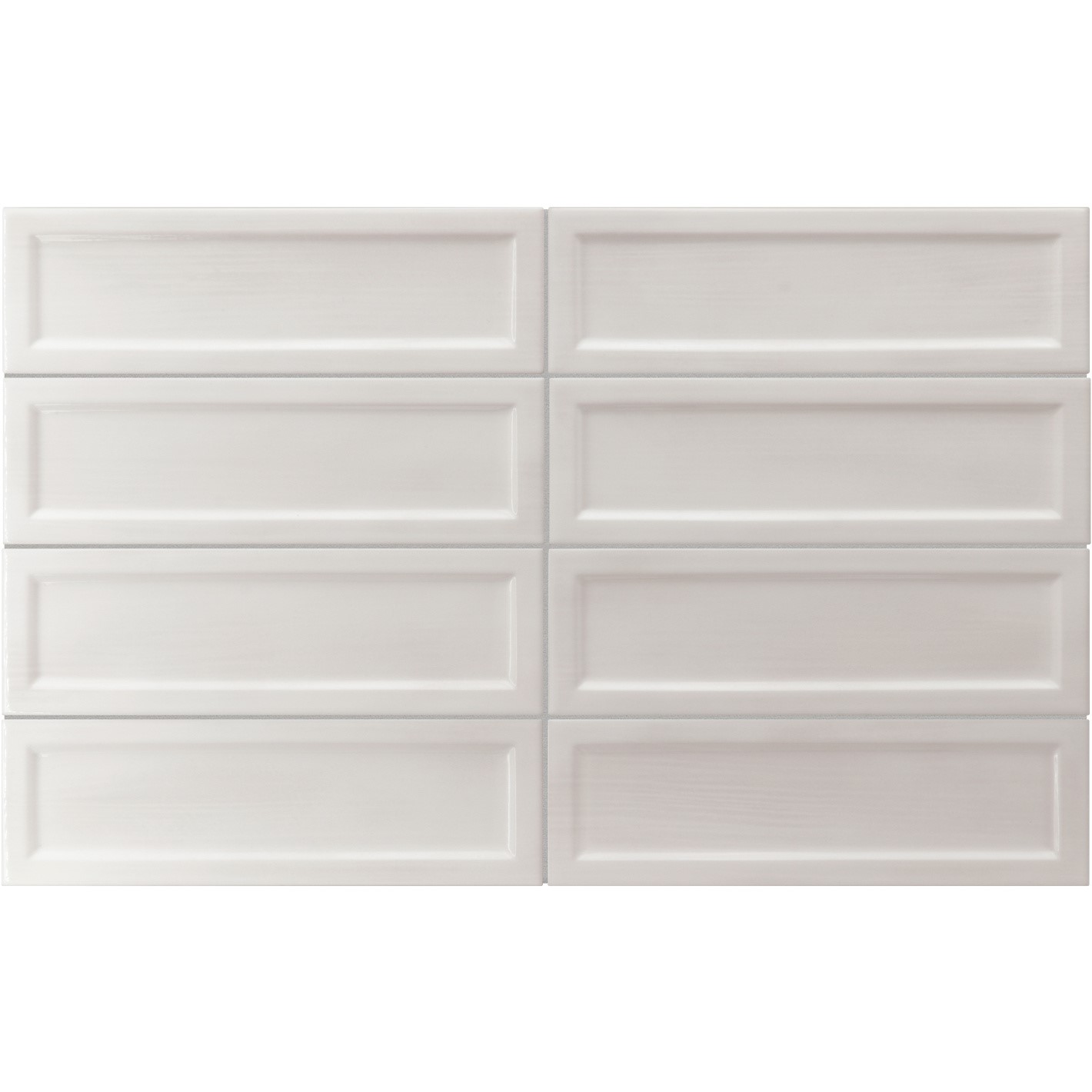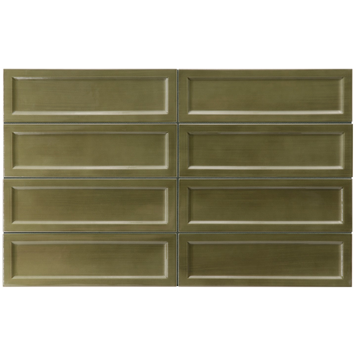 La serie incluye dos versiones complementarias: una pieza lisa y otra con relieve decorativo, como la que se muestra en la imagen. Este relieve enmarcado aporta profundidad visual y un sutil juego de luces y sombras que realza el brillo del esmalte, creando paredes con mayor personalidad y sofisticación.